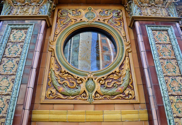 The results of the makeover are spectacular. Just look at the tiled walls and stained glass windows. Take your time and see if you can spot exotic shells, pineapples, and fleurs-de-lis motifs. There are even some clowns!