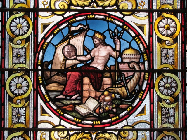The window shows Neptune, the Roman god of the sea, holding the world in his hand. By his side a cornucopia (a horn of plenty) symbolises prosperity. Around Neptune are four images that symbolise Belfast’s major industries at the time the Harbour Office was built.