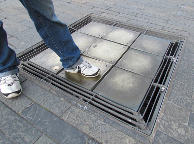 You should hear bells chiming! Under each tile is a small bell, each one makes a different note. These dance chimes were designed in the 1970s by Alfons Van Leggelo for the German company Richter Spielgeräte. They are popular in pedestrianised towns and cities throughout Europe and America.