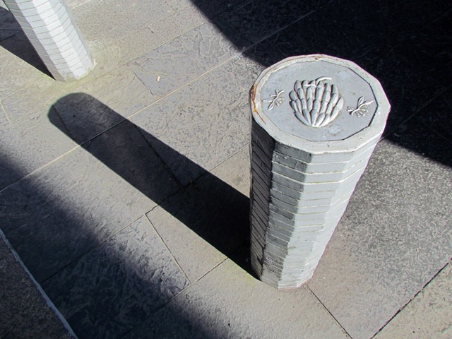 This is part of another public art piece by Peter Rooney. Called ‘Wheels of Progress’ it explores the history of migration to and from Belfast. On the other side of the road some of the columns in the car park are decorated with passport and luggage stamps. These stamps contrast with the old photographs in an attempt to illustrate the transfer from old to new.