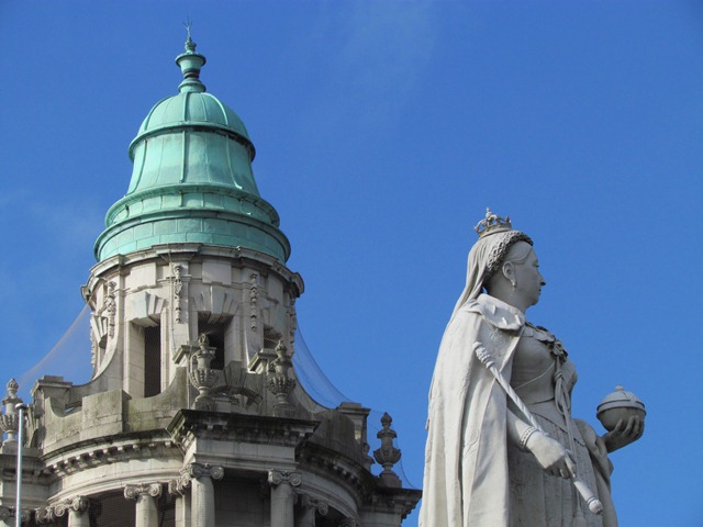 We are going to concentrate though on two memorials on the front lawn. The statue of Queen Victoria symbolises her role in Belfast’s history. It was Queen Victoria who awarded Belfast city status in 1888. The statue shows Belfast’s industrial wealth and prestige.