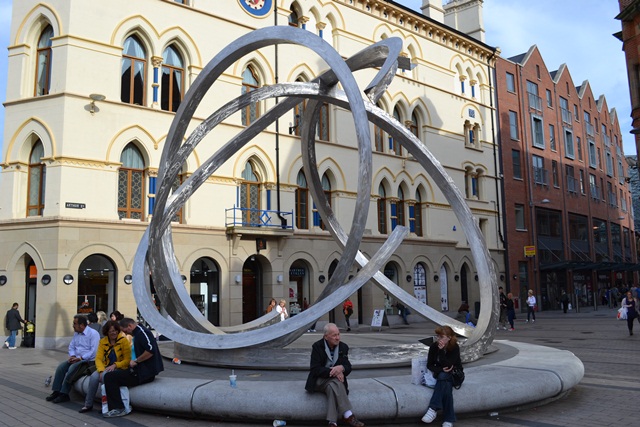 The impressive 20-foot sculpture shows a female figure standing on a globe. The figure borrows imagery from Celtic myths and holds a hoop called “the ring of thanksgiving”. The globe below represents international peace and harmony. The statue’s location, next to Queen’s Bridge, represents bridges being built across divides in the community.