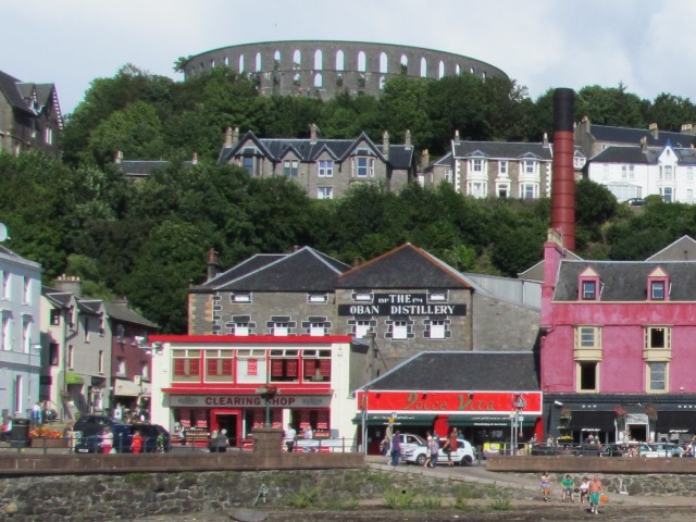 From here we can see two of Oban’s landmarks, the whisky distillery and McCaig’s Tower. Oban Distillery is on the right of the street with a tall chimney while McCaig’s Tower stands on the horizon. They both developed because of the town’s access to water and stone.