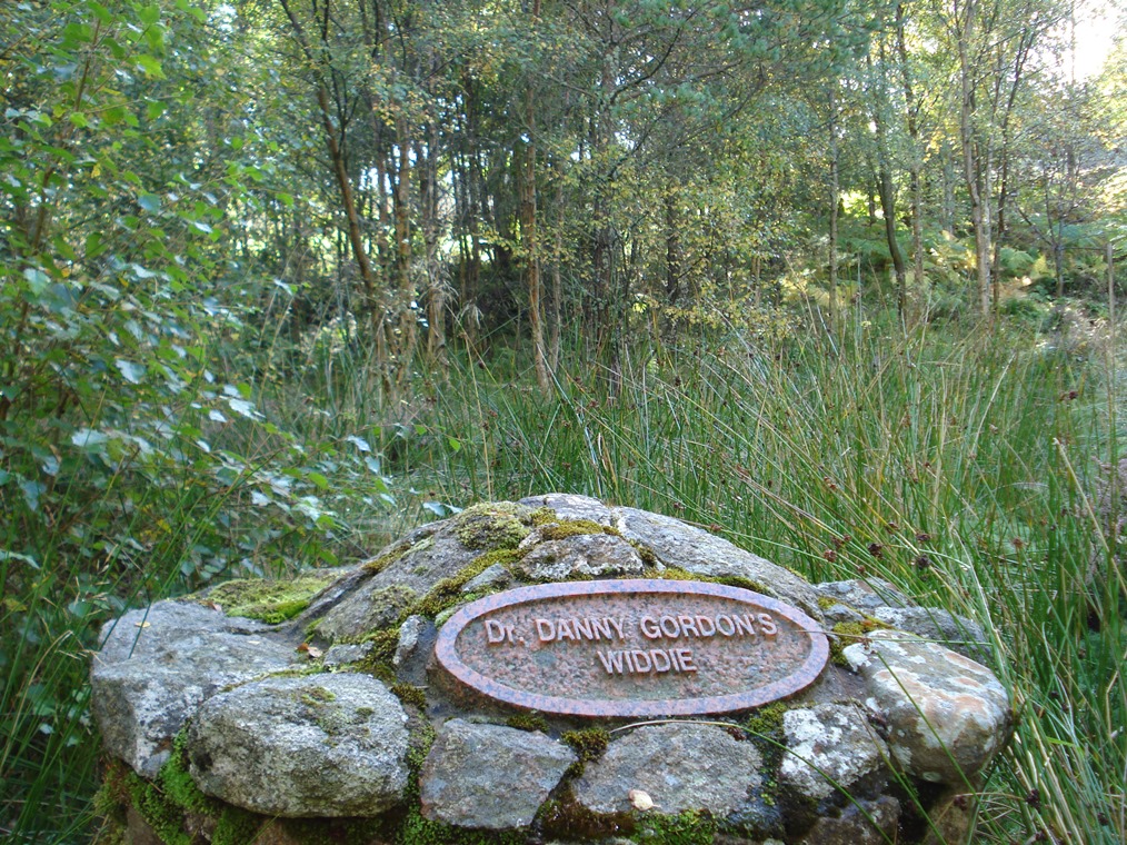 From the Gouk Stone, retrace your steps along the grassy path to the gravel path and turn right. After about 200 metres, look on the left side for a few stone steps down to a little bridge over the stream (Clachie Burn). Go across to the granite cairn marked with a plaque indicating ‘Dr Danny Gordon’s Widdie’.