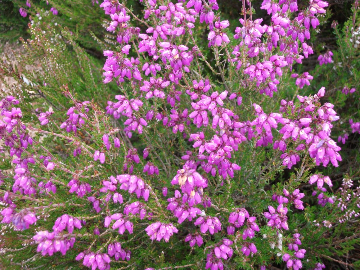 In wetter areas of the moor, you will find Crossleaved Heath (Erica tetralix), a type of heather with pink flowers that gets its name from the distinctive whorls of four leaves that occur along its stems.