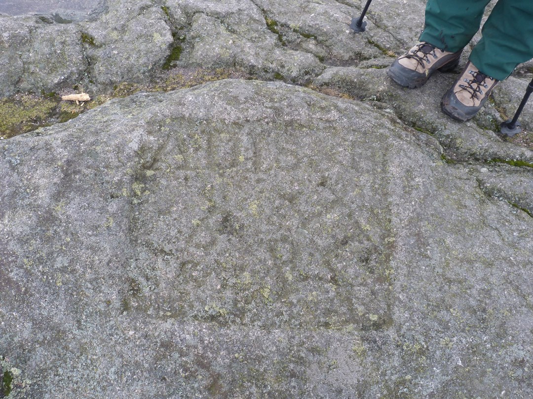 Here on the summit of Mither Tap look between the trig point and the viewpoint indicator for a carving in the bedrock. You might be able to just make out AD 1858 BPLE. The letters stand for three estates: Balquhain, Pittodrie and Logie Elphinstone.