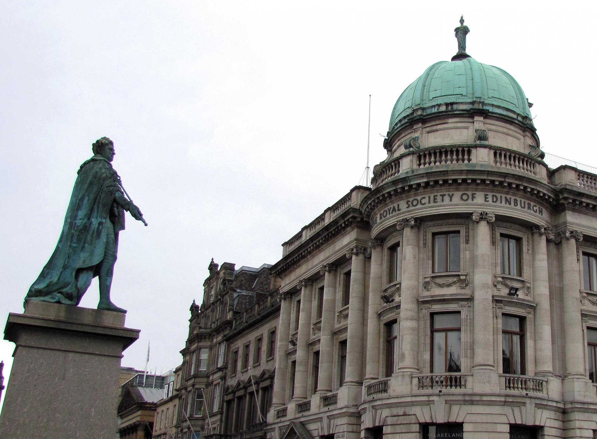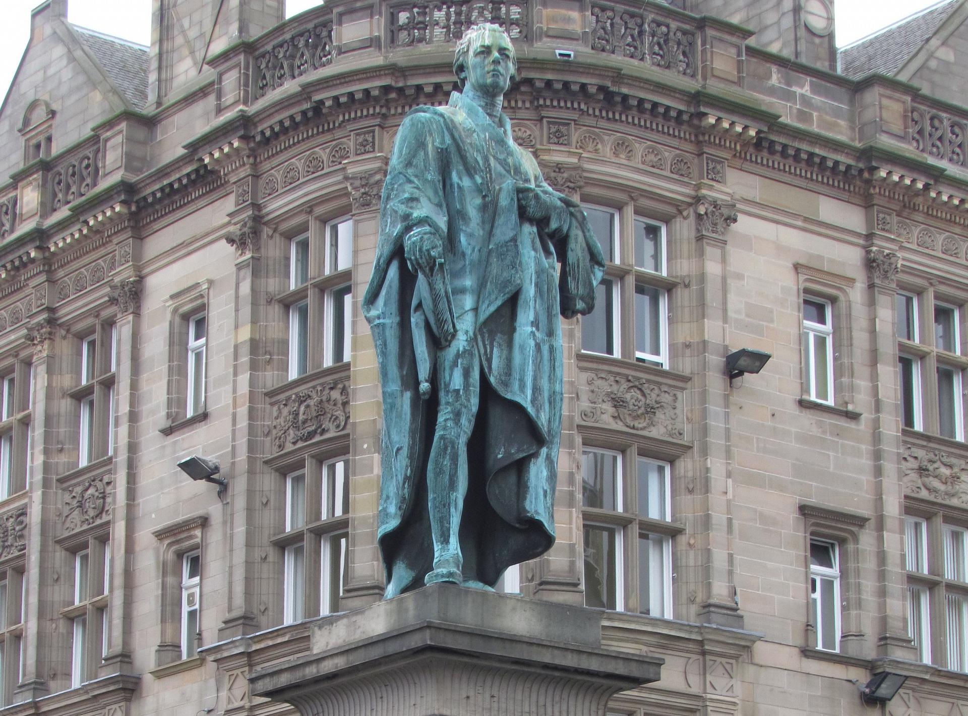 Cross St Andrew Square and with the column behind you cross the road ahead. Continue to a building slightly set back from the road and with a statue of a man and horse outside. Stop at the iron railings by the pavement.
