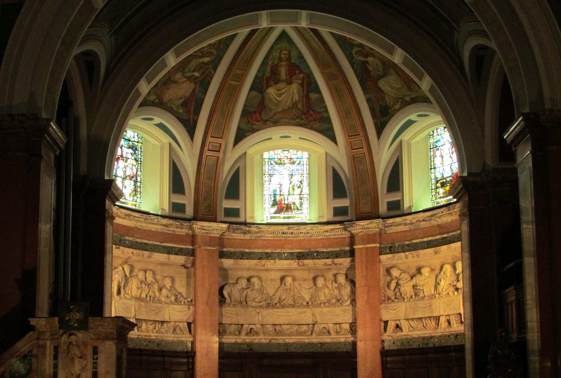 Inside, the font, pulpit and communion table are made from Italian and Egyptian marble. Above the altar is a spectacular alabaster copy of Leonardo da Vinci’s wall painting The Last Supper, which shows Christ having his last meal with the apostles. One of the stained glass windows meanwhile shows David on the way to meeting Goliath. The window is by the famous Tiffany & Co of New York.