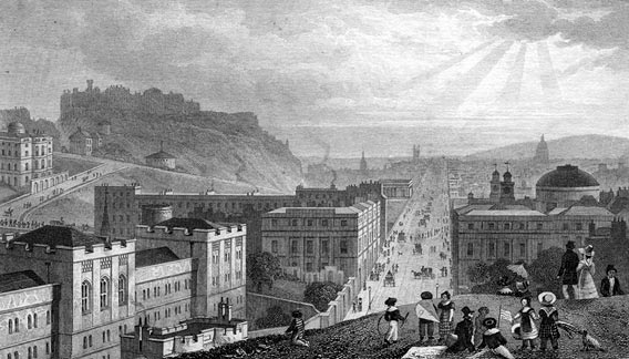 From here up on Calton Hill take time to look at the spectacular views across Edinburgh, as well as Leith Docks and the Firth of Forth. Look across the city and we can trace our route through Princes Street Gardens and George Street.
