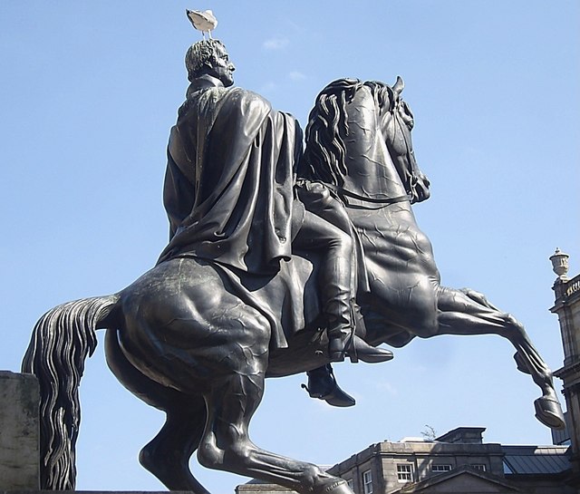 Leave St Andrew Square by South St Andrew Street. As you pass take time to look at the bank building next to Dundas House which is another spectacular piece of neo-classical architecture. When you reach the junction with Princes Street turn left. Continue on the left hand side a short way until you are outside the National Archives of Scotland. Stop at the statue of a man on a rearing horse.