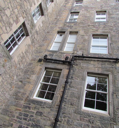Along the sides of the Royal Mile there are many narrow streets, known as ‘closes’ or ‘wynds’. Some of them lead to courtyards like this. Others are alleyways and staircases that cut through to elsewhere in the city. A few are closed off and private property.