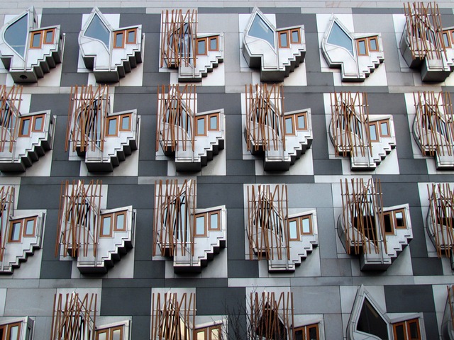 Outside are seats shaped like fishing boats, reflecting Scotland’s strong ties with the sea. The national imagery continues indoors. For example, the roof of the debating chamber features a series of saltire crosses similar to those on the Scottish flag.