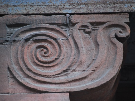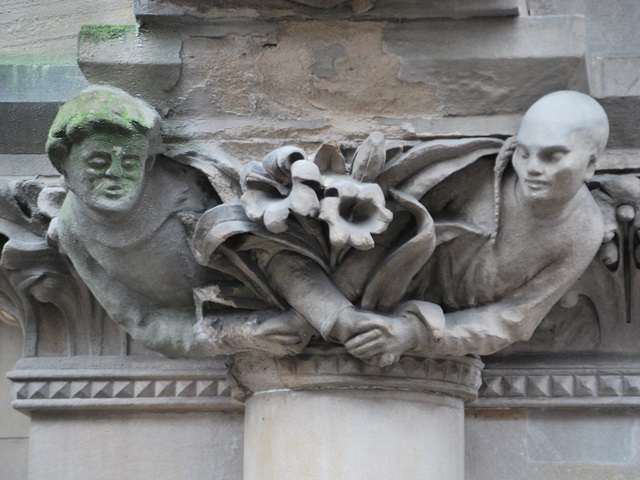 Most importantly, it features examples of the stylised flowers for which Mackintosh is now so famous. Flowers shoot up the sides of the building. At the far end of the 6-storey section, below the chimneys, look up at the carved sandstone above the window. This simple rose motif has launched a thousand items in souvenir shops, which helps to sustain Glasgow’s economy today.