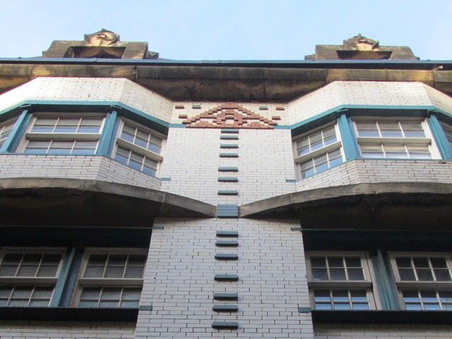 Nevertheless, the building here includes many features that make Mackintosh’s work so respected today. The building has an entirely modern style for its date, yet Mackintosh still brings to it important elements of traditional Scottish architecture. An important part is his use of decoration. Look at the coloured tile work and at how the white tiles help to lighten this dingy street.