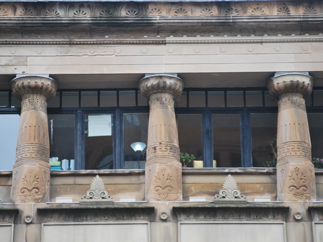This building, with its very solid Classical outline, is known as Grecian Chambers. It is another chance to see the work of Alexander Thomson. By now we may be able to recognise his style. Have a look though at the top-floor gallery which sits behind a row of Egyptian columns. These are much too squat to have been used by the ancient Greeks!