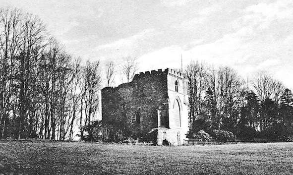 Notice that the modern metal gate is fixed between two, much older, stone piers. Beyond the gate are the remnant standing walls of the Lodge.