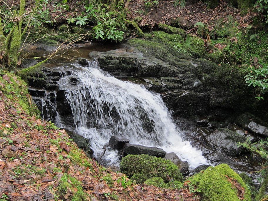 Follow the main footpath that leads downhill from the castle. After a short distance look for a drainage ditch that passes under the footpath and a very large beech tree to the right of the footpath. Immediately after passing over the drainage ditch take the small path to the left. The path may be overgrown, but you should be able to make your way along it to a painted wooden post with the number 6 which overlooks a ravine and waterfall.