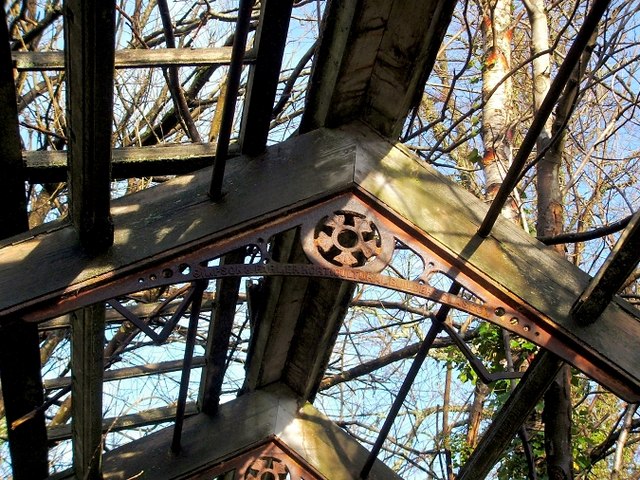 Look on the north wall for the partially-collapsed wooden and iron frames of the glasshouses bearing the stamp of their makers, Simpson and Farmer of Glasgow.