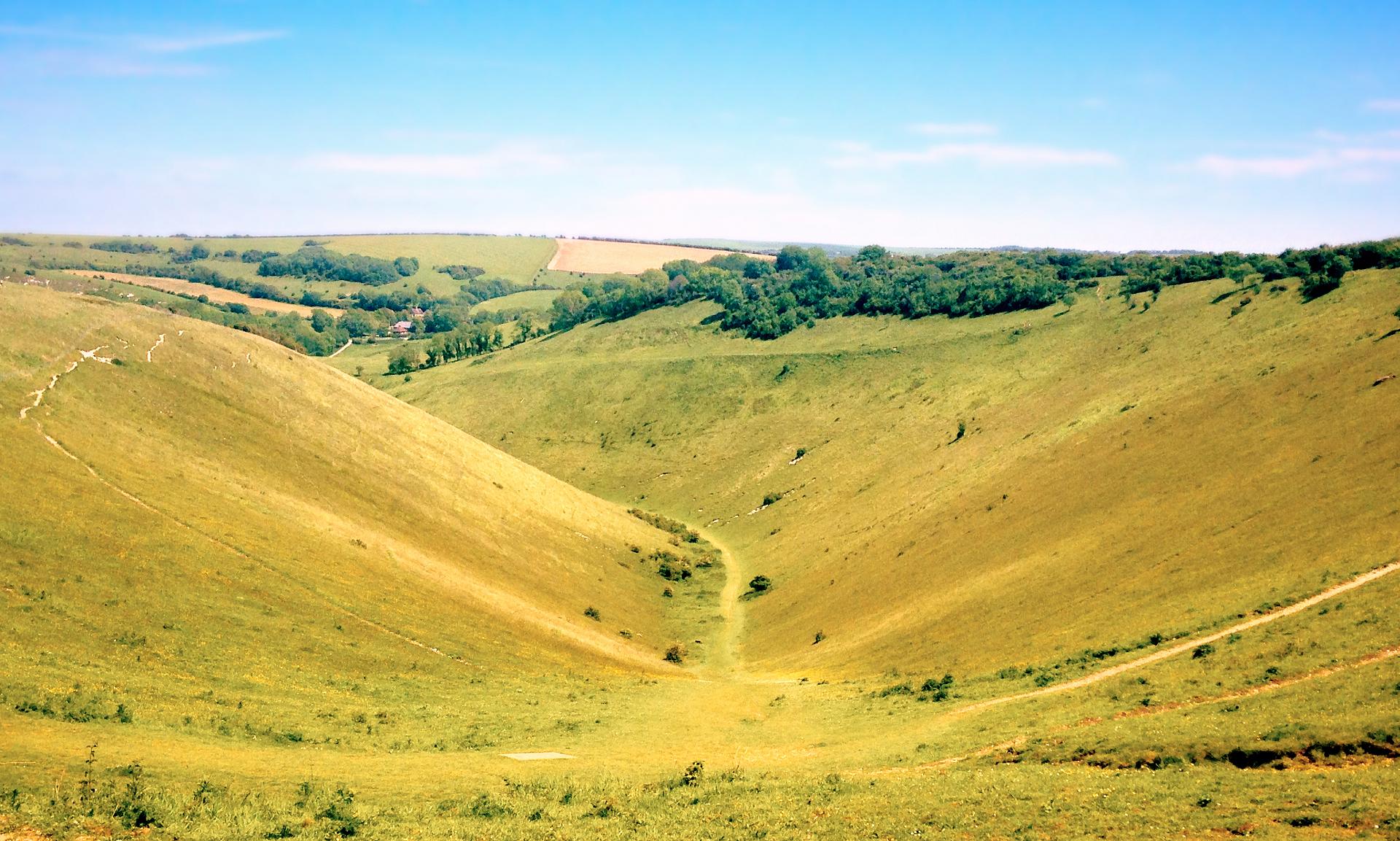 This is the Devil’s Dyke, the longest, deepest and widest dry valley in Britain. It’s a perfect 'V' shape, a graceful gorge carving its way sinuously through the hills with steep, curving slopes on either side. But there’s something missing. You would normally expect a river to have carved out a deep valley like this one, but the Dyke is completely dry. Where is the water?