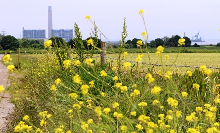 Though perhaps not a traditionally beautiful view, the vista from here sums up the complex character of the Hoo Peninsula. In this low-lying spur of land vertical structures like the chimney of Kingsnorth power station straight ahead dominate the view, and along with views of Tilbury power station on the Essex coast add to the common perception of this as an ‘industrial’ landscape. Kingsnorth is now decommissioned and being demolished.