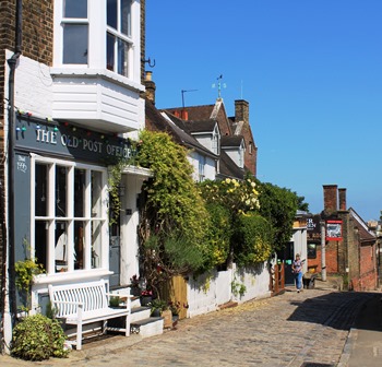 Look along Upnor High Street as it slopes gently downhill towards the river. As you continue along this traditional cobbled street, notice how well preserved it is. Most of the houses date from theseventeenth and eighteenth centuries and are made of local materials, including yellow brick and Kentish weatherboarding. The houses have been lovingly cared for and the original features like sash windows, distinctive railings and doors all add to a sense of its history.