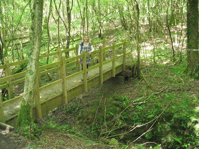 Go downhill through the gate into Little Worge Barn. Go past the car port, out through a metal gate and along the path straight ahead to descend into woodlands. In the woods pass two sets of gates on either side of the path, then turn right at a signposted four-way path junction by a barrier and follow the woodland path, across a semi-open strip with power lines, to stop on a wooden bridge over a ravine.