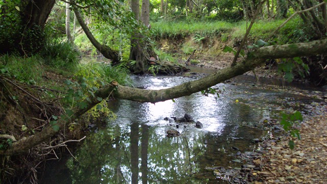 Here notice that some trees along the bank are trained with horizontal branches, as part of an ancient, long-gone hedgerow: these were cut and laid to protect the woodland from browsing creatures, notably cattle.