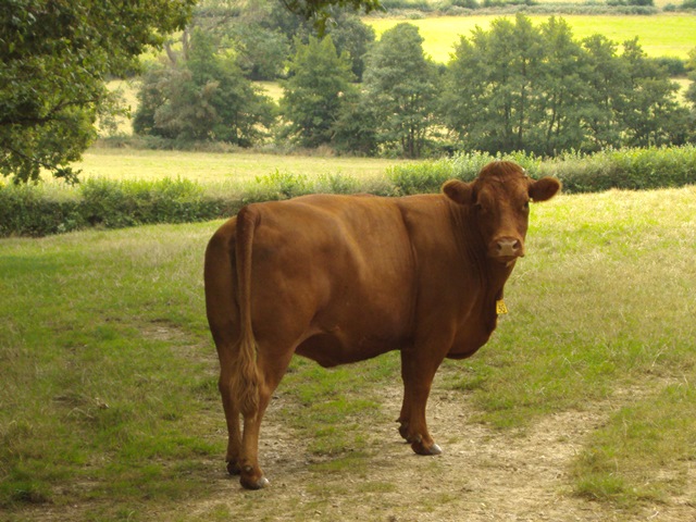Looking out over the fields and the valley, you may see here – and elsewhere on the walk – Sussex cattle. They are distinct for their hides of chocolate-brown colour (officially described as ‘red’).