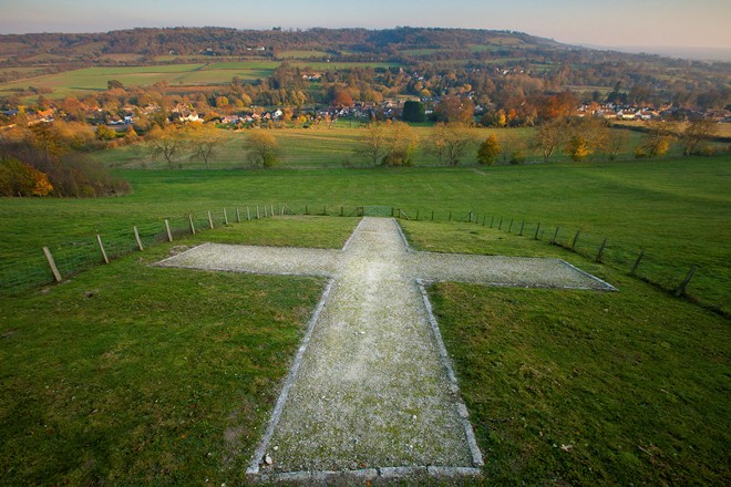 The Shoreham chalk cross you can see is one of many artistic chalk cuttings found in Southern England. During the First World War a Shoreham resident, Mr Cheesman, lost both his serving sons in action, Richard and Cecil. So with the help of the then vicar of the local church he proposed the idea of a cross cut into the chalk on the hill to remember them and others who died.
