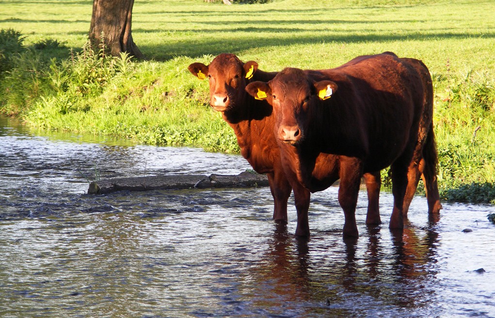 Cattle can normally be seen grazing these permanent pastures between April and October but in winter these fields can easily flood as rains swell the river and grass growth slows and it can no longer sustain a grazing herd. Conditions quickly become too muddy therefore throughout the winter all our cattle are housed in purpose-built buildings on comfy straw and fed on hay, silage and cereal proteins.
