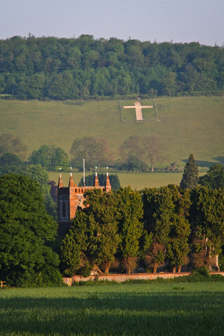 At the T-junction turn right into the High Street. After 100 metres turn left onto an unsurfaced lane signed ‘The Landway’. Follow the footpath up past the playing field and beneath mature beech trees. Continue to follow it upwards between two hedges. Stop when you emerge at a stile into a sloping field. Look right to take in a good view of the chalk cross on the hill.
