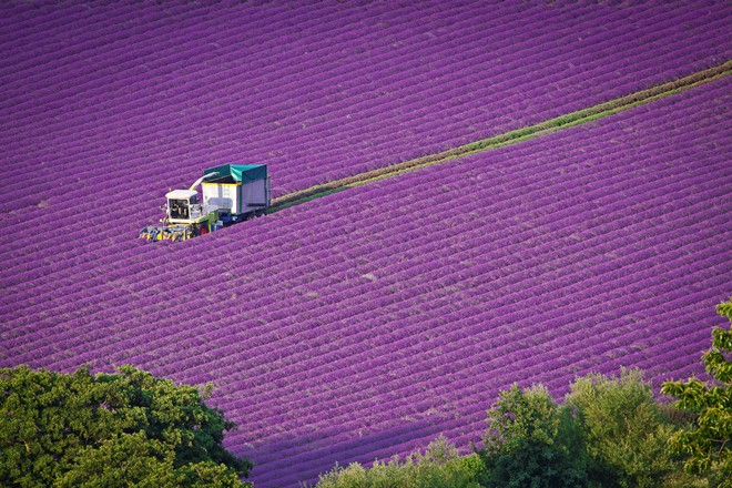 Although lavender bushes may appear rather grey/brown throughout the winter, in April fresh green leaves unfurl followed by a first mauve haze of flower buds appearing in late June. The colour becomes more intense by the day until, in late July, the sea of purple flowers looks simply stunning. Warm sunny weather helps to build oil content within the plant, which peaks around full flowering. A specialist harvester is used to cut and collect the flowers into large trailers, which are immediately transported to the farm distillery, where steam is used to extract the precious aromatic oil.