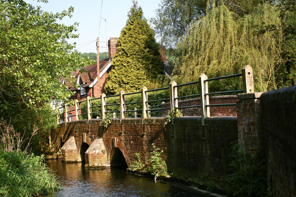 The small settlement of Shoreham grew here at the narrowest section of the valley where it was feasible to ford the river. Although no longer in use there is still some evidence of the ford on the downstream side of the bridge. The bridge, built of brick and flint, is formed of three low arches and dates from the nineteenth century, although there was probably an earlier medieval bridge here.