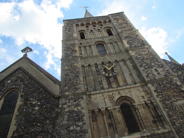 When you are ready, leave the church and return to Cannon Street. Facing the tower, take the path to the left of the church. Turn right at the end and stop on the path before the car park. Look at Dover Castle on the hill.