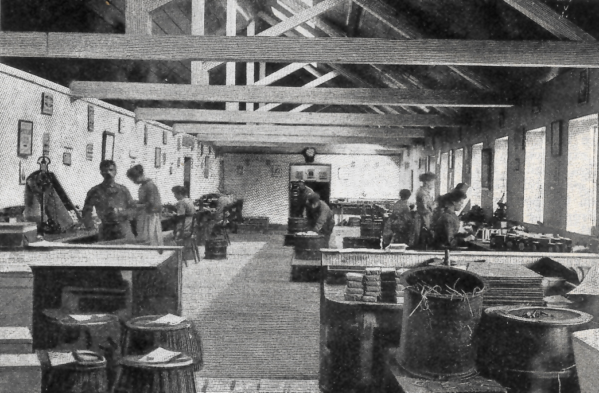 There were a number of geographical reasons why Faversham became an ideal site. The willow beds to the west of here at Bysing Wood grew renewable alder. Alder was converted into charcoal, an essential ingredient for gunpoweder manufacture. Another vital ingredient, sulphur, could be extracted from copperas found in nearby Tankerton. Later on sulphur was imported by ship from a volcano in Sicily. The third component, saltpetre, was sourced from urea-soaked straw beds that were transported by ship at the eastern end of the creek.