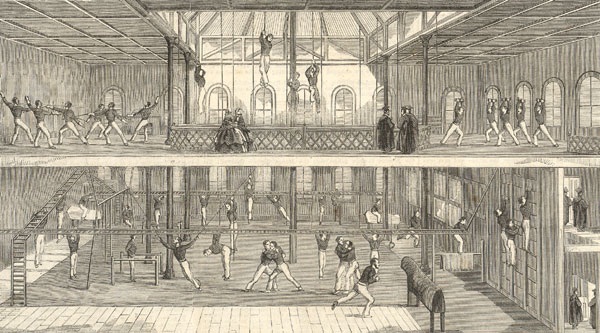The gymnasium was equipped throughout with the ‘latest gymnastic contrivances’: padded floors for exercises, climbing frames and ropes, and a central Norwegian climbing pole 60ft high. The gym’s owner, Archibald McLaren, was a well-known expert in physical fitness. He invented the gymnastic training programme for the British Army and wrote books on the subject.