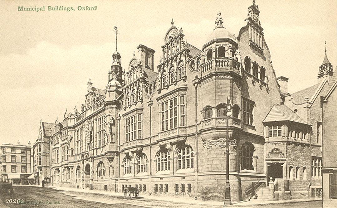Several civic buildings have stood on this site over Oxford’s history. A guildhall (a meeting place for craftsmen like textile workers and masons was first built on this site in 1292. It was replaced in 1752 by a Town Hall which itself was demolished in 1893 to make way for this current building, the new Town Hall. Both the old and new Town Halls included large spaces for public meetings and concerts.