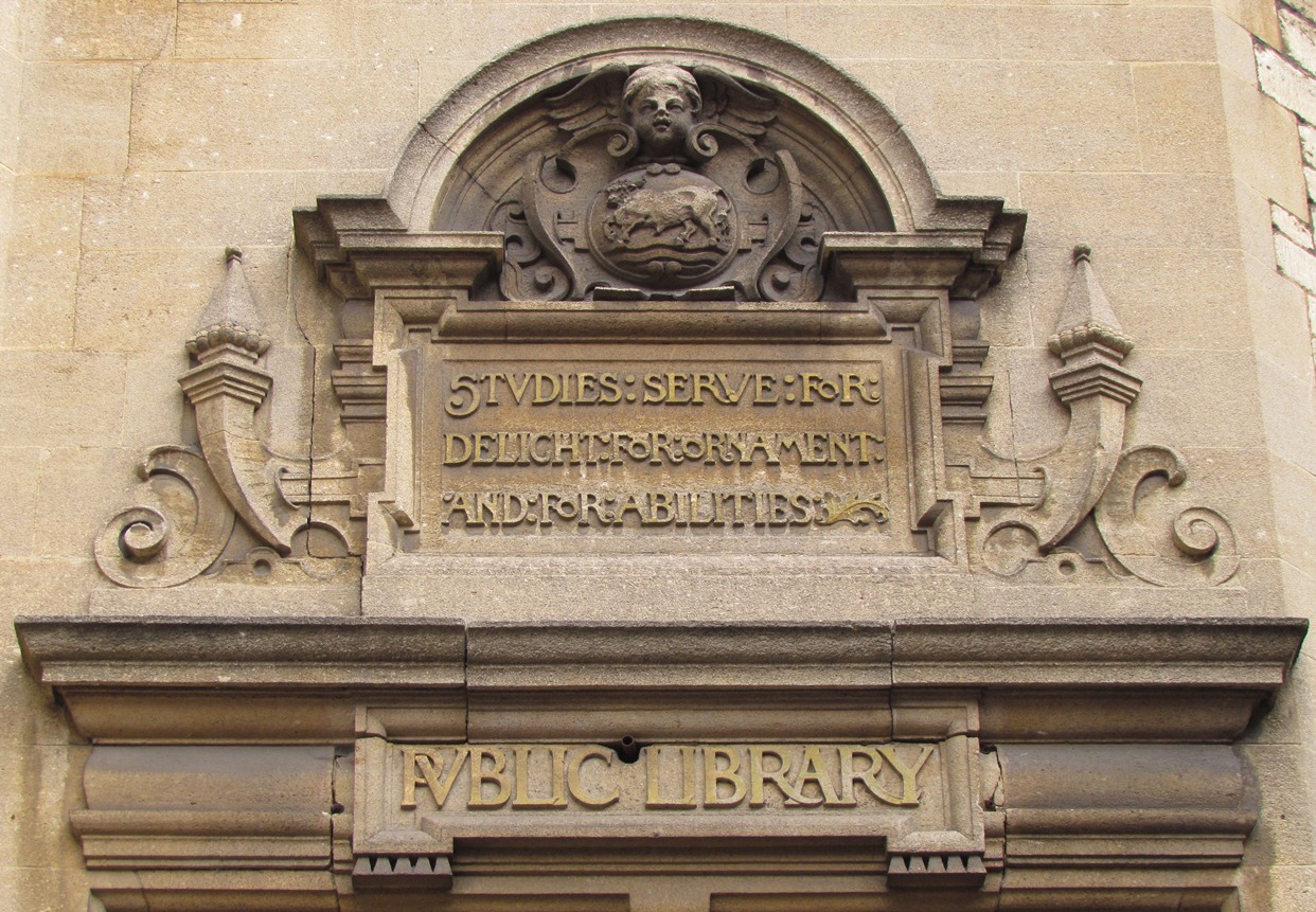 Look across at the curving stone steps which lead up to a lovely wooden doorway with the words Public Library above. We’ve stopped here to think about Oxford’s public library provision.