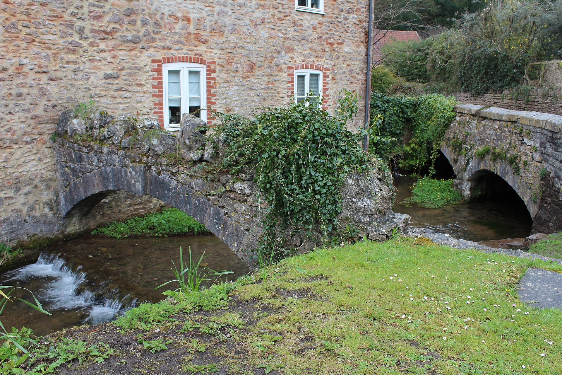 Park outside the church. With the church on your right, walk along the High Street until you reach an arched stone bridge over a stream on your left,. Stop here alongside a group of buildings.