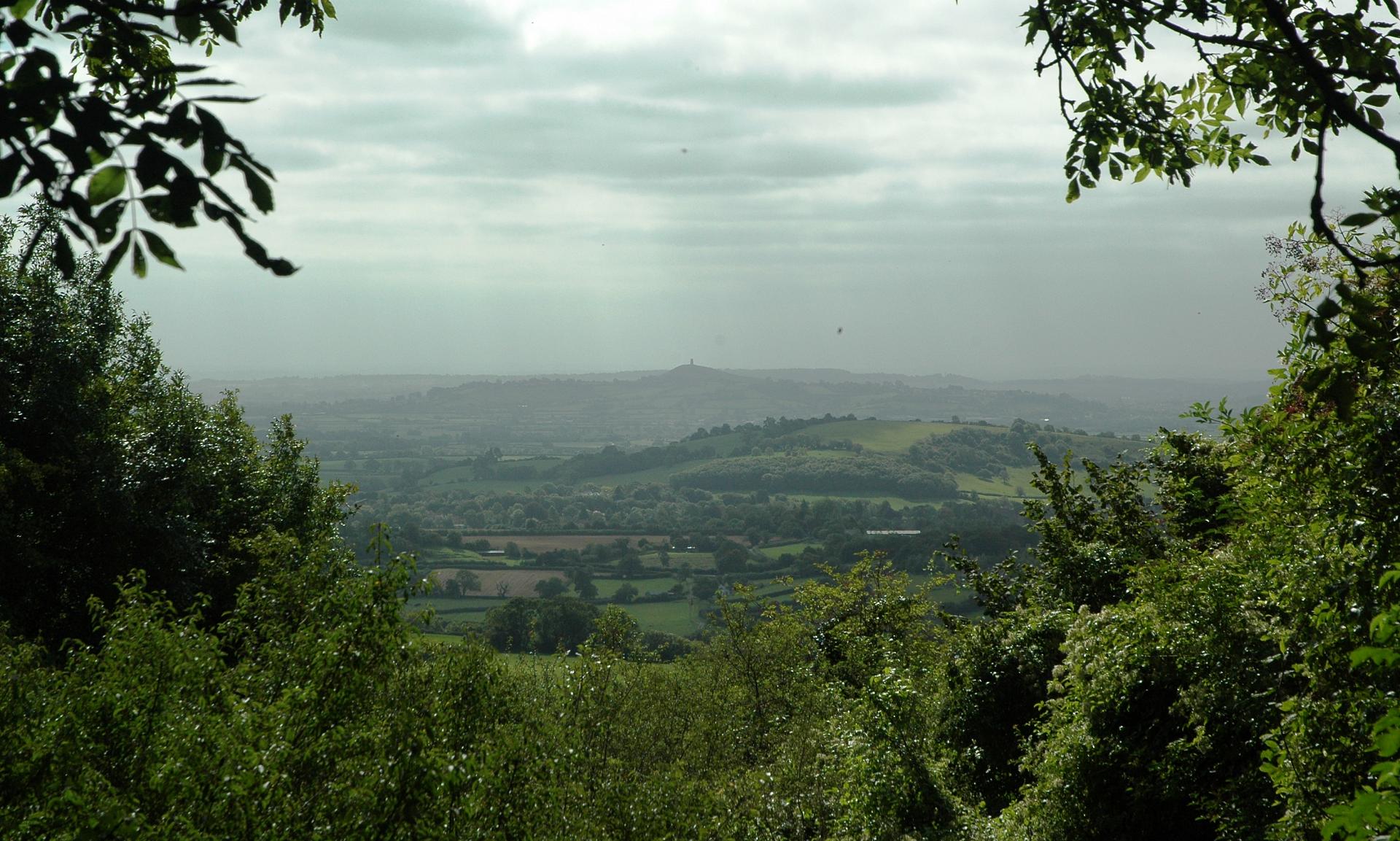 Straight ahead looking south you should be able to make out a perfectly rounded hill with a cone shape on top. This is Glastonbury Tor (6.5 miles away) which rises up from the flat vale of Avalon. Just in front of the tor, the flat, low-lying land is the Somerset Levels, one of the lowest parts of the British Isles and often prone to severe flooding. Over to your right, the line of dark hills is Exmoor National Park.