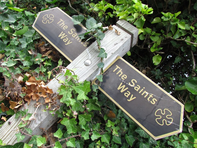 When you are ready, retrace your way back though the field. Keep close to the hedge and make sure you close all gates behind you. Follow the track downhill to the Saint’s Way signpost.