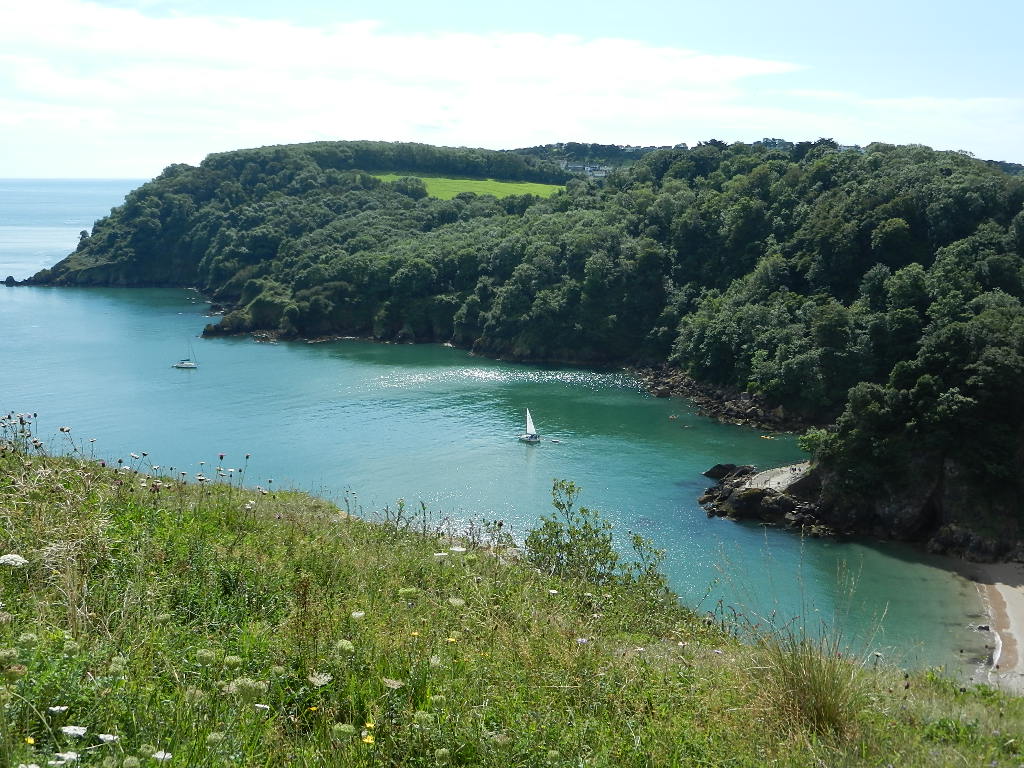 After about 300 metres you emerge on to an open grassy area. Stay on the right hand side with a fence and hedge on your right. Follow the fence round until you reach the barred gate and path down to Redgate Beach. Follow the fence a little further round the next corner and stop at the end (near a bench) where there is a good view down to the beach.
