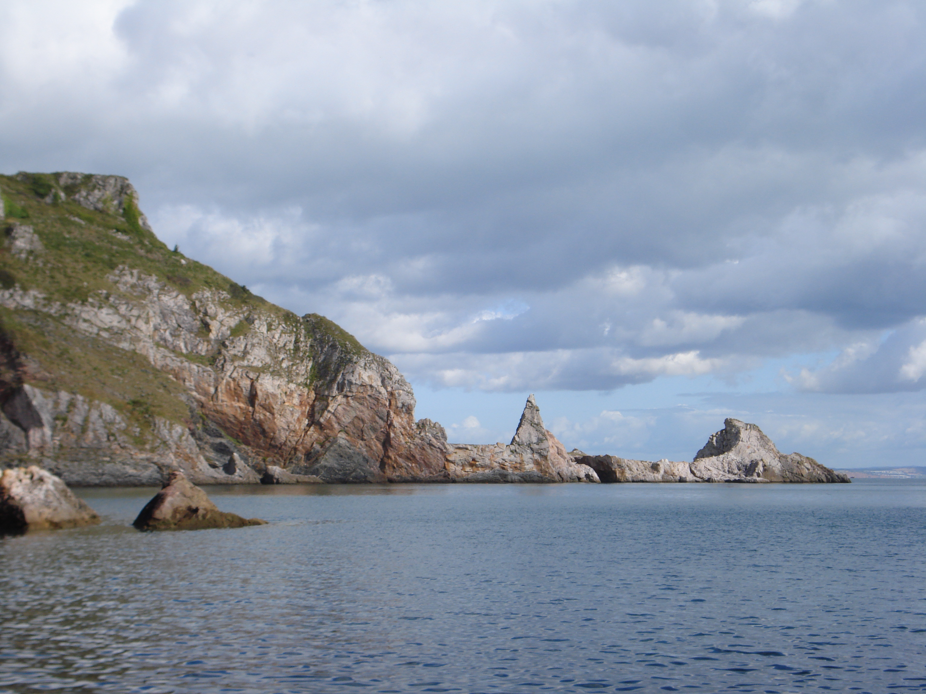 Now look across the bay to the high pinkywhite cliffs which are made of the Devonian limestone that we learned about earlier. Look carefully at the layers of rocks and try to follow some of the lines.