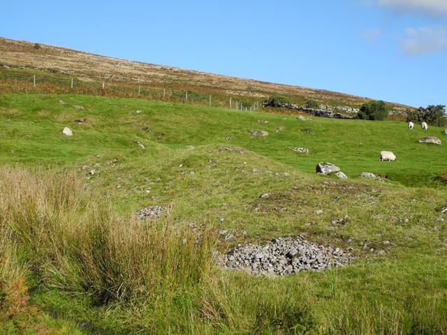Continue along the track for a short distance until you reach the first obvious footpath on the left hand side. Follow it towards the conifer trees. Cross a small stream and then as soon as you reach the first trees look up the hillside on the right and you should see a walled and fenced enclosure. When you are below it on the path, turn right and follow a very narrow footpath about 10 metres up through the bracken and brambles to reach it. Follow the fence around to the top.