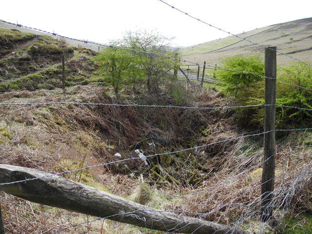 Behind this ruin is the main Golden Dagger Mine. The approach to is it very boggy so it is not recommended. Dug into the hillside to the left is a huge, long gully with the adit entrance to the mine at the end. The lode here ran in an east-west direction across Soussons Down. Three shafts were made to access the underground levels. One of them is nearby and fenced off on the right.