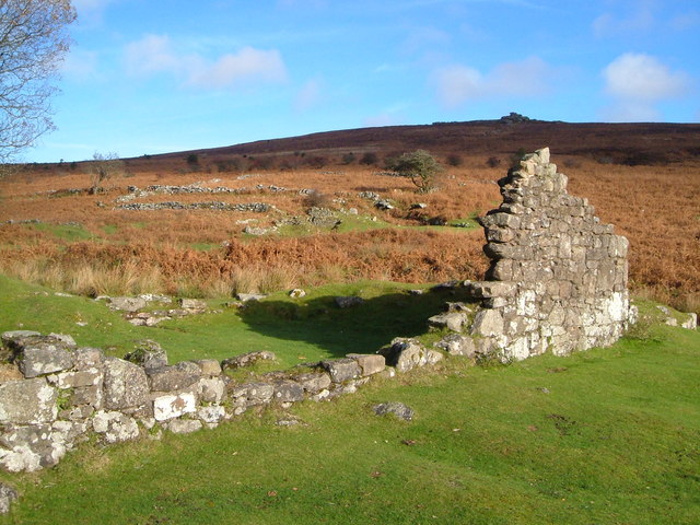 These stone buildings are the remains of the medieval hamlet of Challacombe. Here it is possible to make out the ruins of at least seven traditional Dartmoor longhouses.