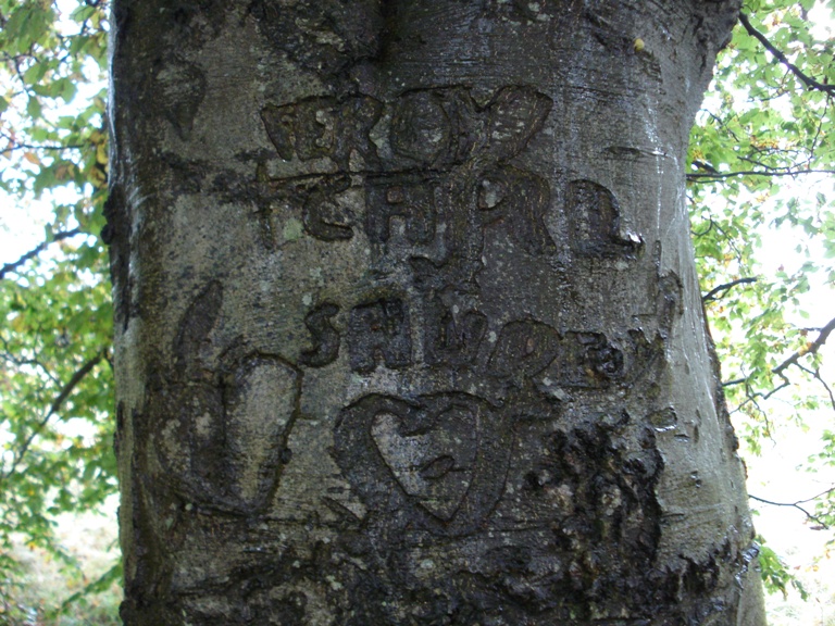 One mark among these trees was made by an American GI as he awaited being dispatched to take part in the D-Day invasion. It says ‘Frank Fearing – Hudson, Massachusetts, 1945’, followed by a love heart and the name Helen. Chantel managed to track down a Barbara Fearing in Hudson, whose parents were Frank and Helen. Barbara was thrilled to see a picture of the mark on the tree and filled in more of the story. Frank had secretly married Helen just a few hours before leaving for Europe to fight. He survived the war and lived until 2001. He had told Helen he would carve her name into a tree everywhere he went in Europe but she didn’t believe him. Although Helen has recently passed away, she was alive when Chantal got in touch, and was able to see a picture of the tree her husband had engraved for her all those years ago.