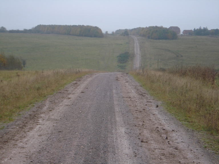 Continue along the track as it heads down into the dip and up the other side. Immediately after a line of trees begins on both sides of the track take the track on the right which is signposted as a Byway. Stop after about 50 metres where you have a good view of the village.