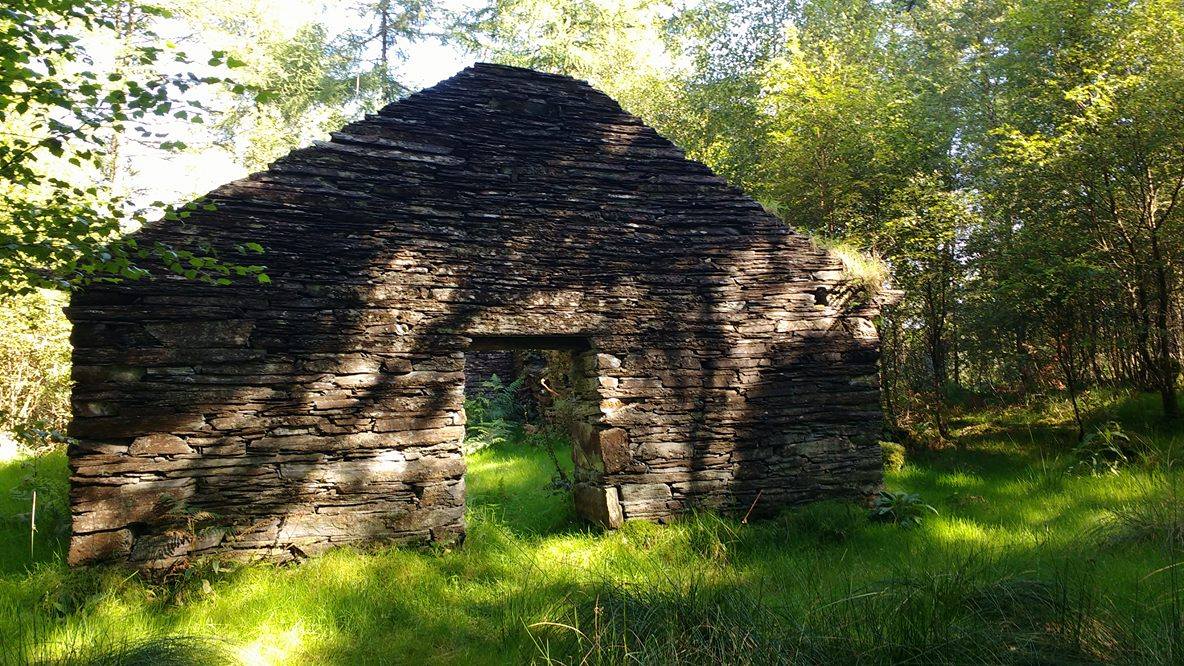 This crumbling, moss-covered hut is a relic of the hillside’s working past. This was probably an eighteenth or nineteenth century dwelling used in ‘hafod a hendre’ farming. ‘Haf’ is Welsh for summer and ‘hendre’ is the Welsh for old settlement or farm. In barns like this one the farmers lived under the same roof as their flock. A ‘Hafod’ was a farm on the higher pastures where they would take the sheep during the summer
