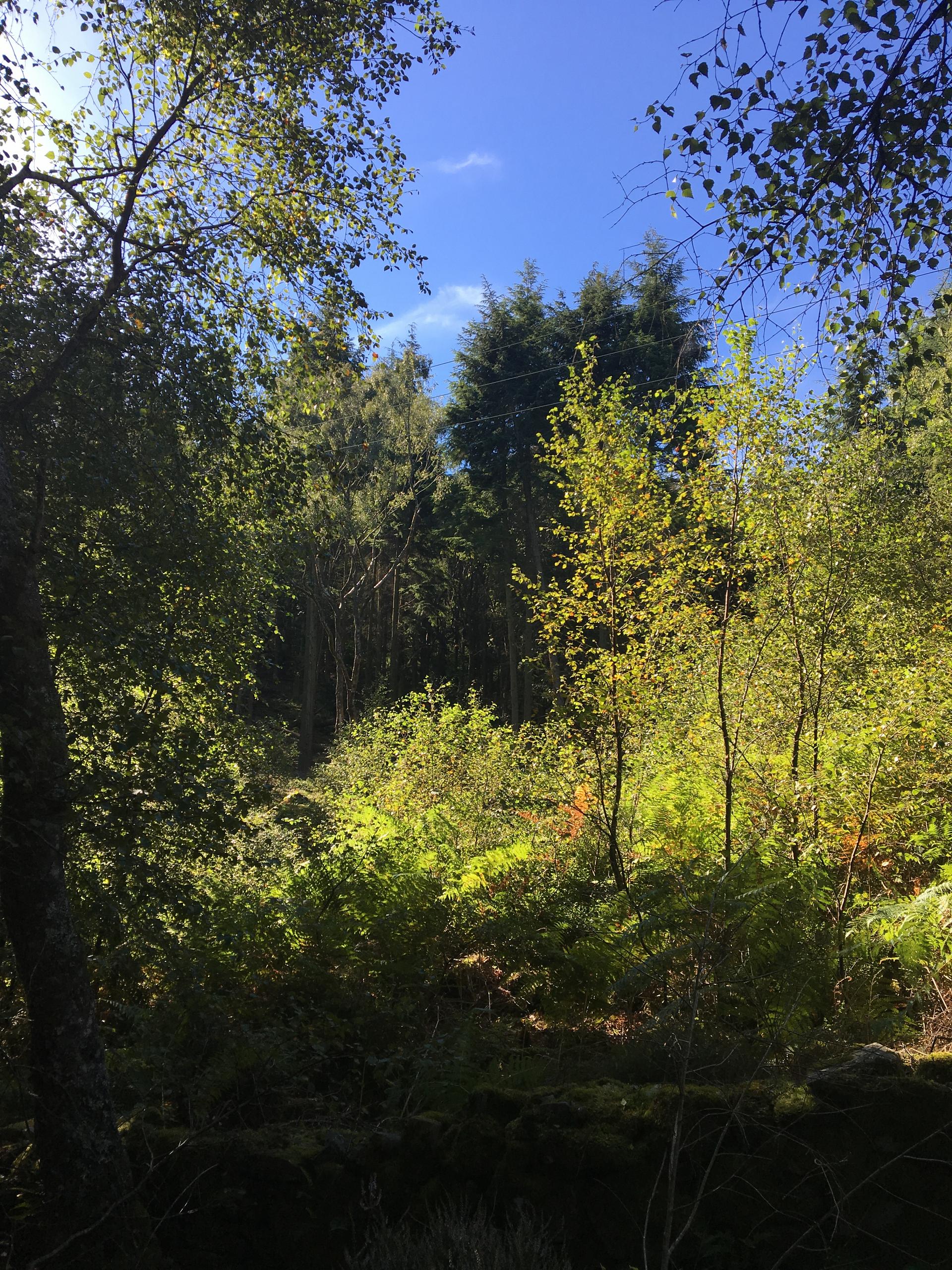 The land of Llennyrch was never planted with conifers. Instead it had a more consistent history of grazing. It remained relatively open woodland, with bluebells popping up in spring and a mossy layer underfoot. The area is still working farmland today.